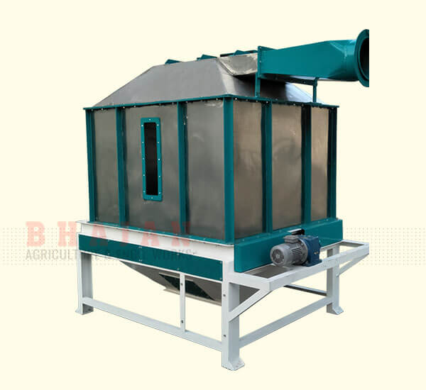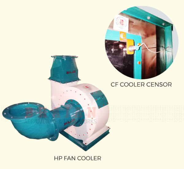 After the pelleting process, hot pellets along with moisture & heat enters the Counter Flow cooler. It inhales the atmospheric air inside its body and exhales the hot air along with the dust particles. The circulation of air is mantained by the HP Fan. The tiny particles and dust etc.is collected with the help of cyclone attached to the exhalation of Cooler. It keeps the binding strength of pellet strong & improves its quality.